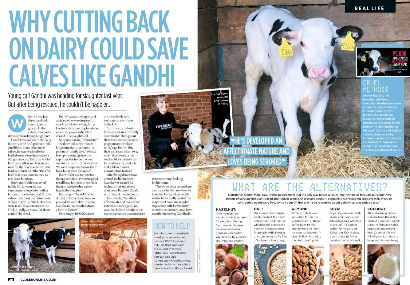 I am really proud of the magazines I write for - they are working really hard to raise awareness of some incredible issues. Closer magazine recently covered the story of Gandhi, a cow rescued from certain death as a by-product of the dairy industry. Working with Animal Equality, this story brings animal activism and ethics to a new audience.