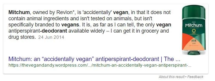I filled out the contact form on the Mitchum UK website to ask of their vegan credentials, because I think even if you can find out by Googling that a company ain't vegan friendly, you should still ask them directly just so that they know they're losing customers. I like to imagine the admin guy printing my email off and taking it up to head office, where he knocks wearily on the door of the Big Man. 'We've got another one, Clive,' he says. A tally of vegan customers demanding better goes up by one on a counter on the wall. 'Jeez,' says Clive. 'We better make this product vegan, the people have spoken.'